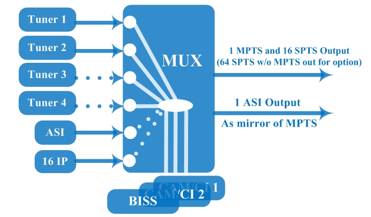 * 2 or 4 Tuner (DVB-C/T/ISDB-T switchable or DVB-S/S2/S2X or ATSC optional) inputs for each demodulation module