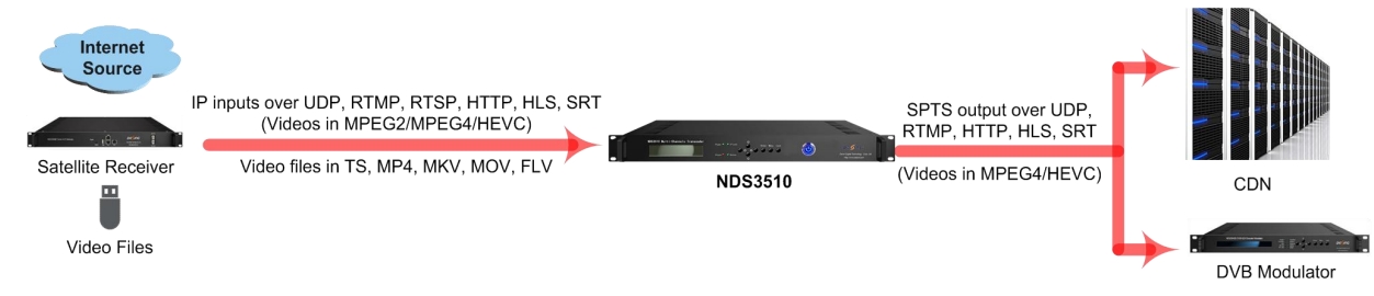 2x GE port, RJ45, Protocol: UDP (MPTS/SPTS); RTMP, RTSP, HTTP, HLS, SRT (SPTS) |