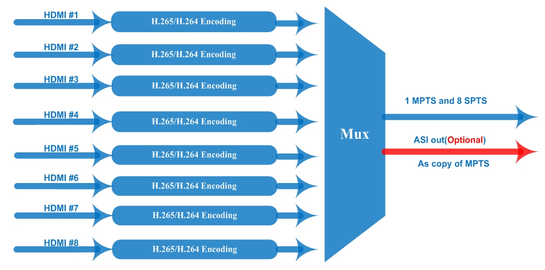 8 HDMI Inputs with 8 SPTS and 1 MPTS out (1 encoder board+1NMS port+1 DATA Port) |